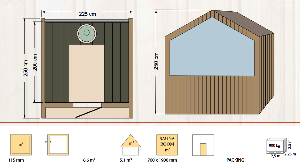 • Transportmaße : 2,50 m x 2,25 m x 2,50 m (Breite x Tiefe x Höhe)